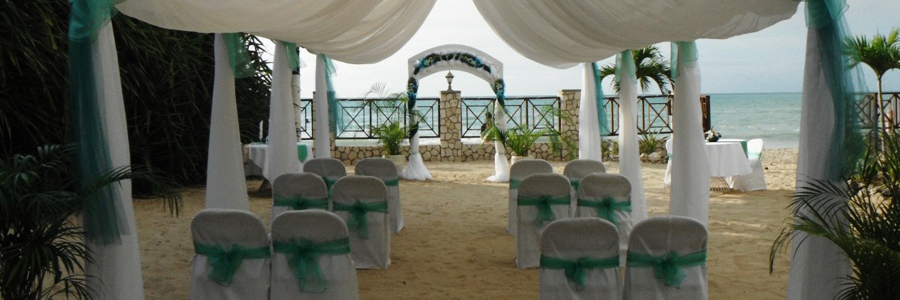 The packages do not include prices for a reception, please contact us directly, we are happy to provide both wedding and reception packages. You would start by choosing the date for your special event. Weddings are held in our sandy courtyard next to Negril’s beautiful beach, under a gorgeous decorated canopy. For weddings with 20 or more people, a decorated tent is included at cost. Our Signature Wedding Package pricing is based on the couple and up to four guests attending the ceremony. If you are holding a reception, the ceremony area is rearranged with tables and chairs, etc.